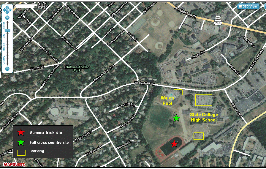 Directions and map of Club pratice sites Directions In State College, PA: from Atherton Street (Route 322 Business) turn right if traveling south (from Penn State campus side) or turn left if traveling north (from Boalsburg side) onto Westerly Parkway. Pass Obryan Ln and turn left onto school parking lot. Go around the school building (clockwise) to the backyard parking lot near the track.